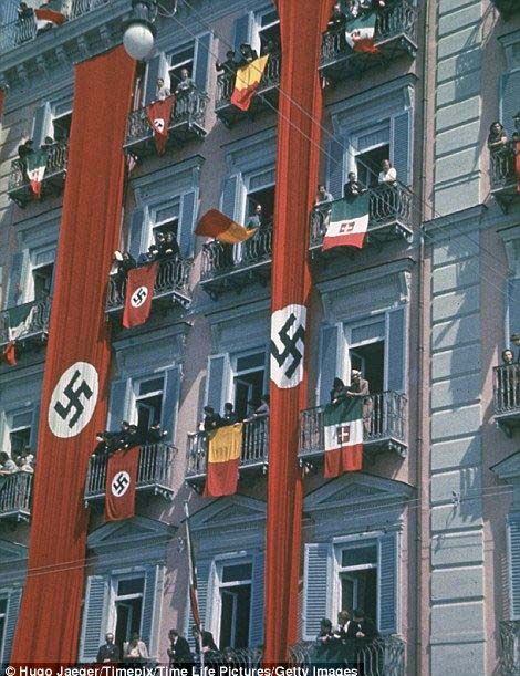 希特勒对意大利进行国事访问期间,纳粹旗帜、德国国旗和意大利国旗从阳台上垂下。